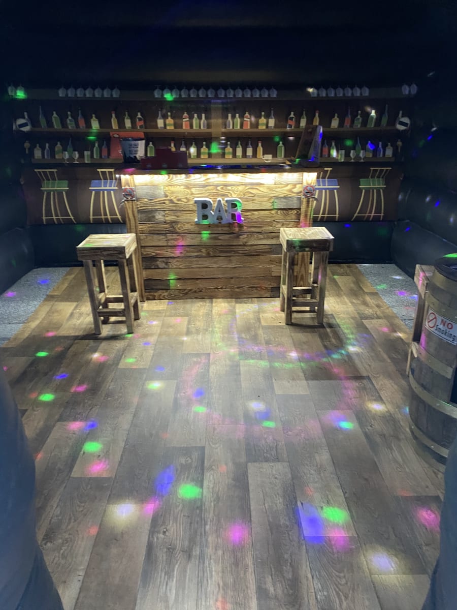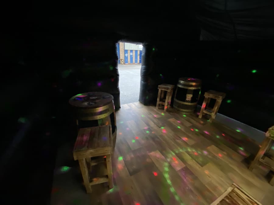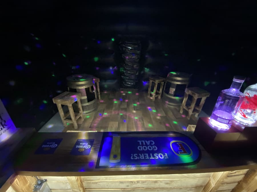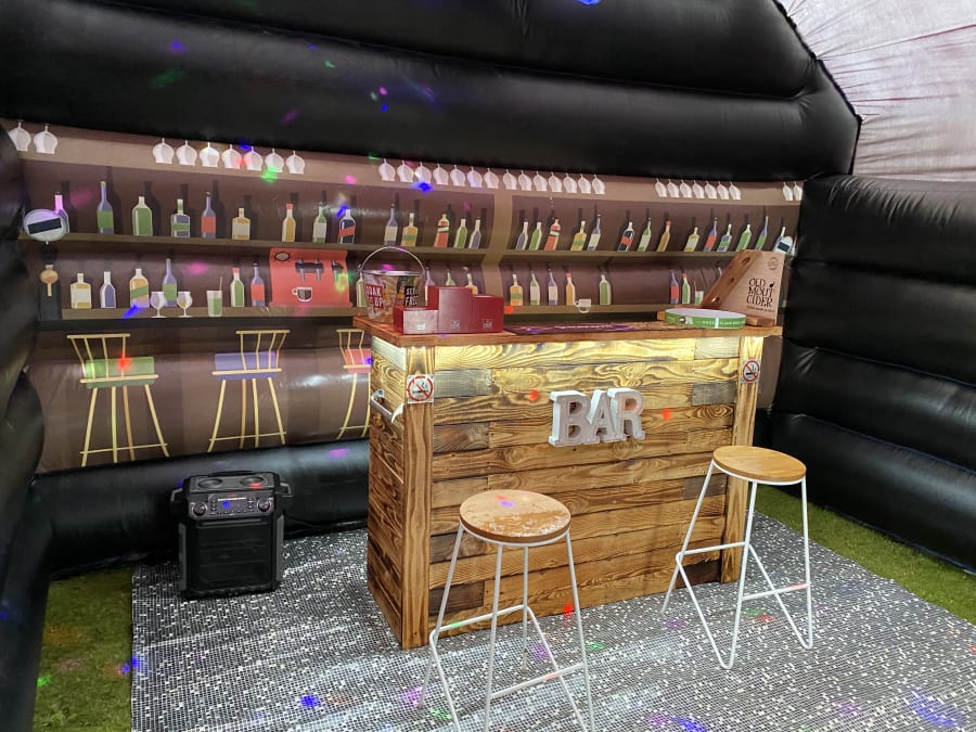 Disco nightclub inflatable pub not like our giant and large pub can go onto hard surfaces us well us grass comes with 2no high powered disco lights LED lighting wall with 100s off different patterns 1no smoke machine 1no 100watt block rocker speaker to play your music 1no illuminated bar with beer pump attached only for show 2no ice beer barrel tables each one holds up to 8bags off ice to keep your drinks cool 6no bar stools soft wood affect floor light up beer bottle stands and ice bucket beer mats and coasters and space heater to keep your party warm or air cooler to keep it cool we drop off mid morning or times to suit your needs collect next day free delivery in the Hull area small delivery fees apply in areas outer the boundary off Hull for more information please contact us on 07740397745