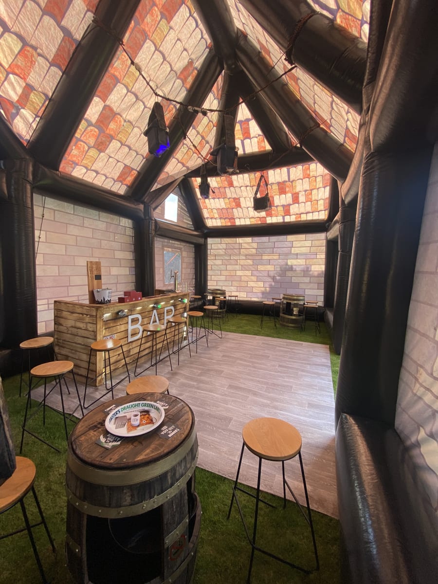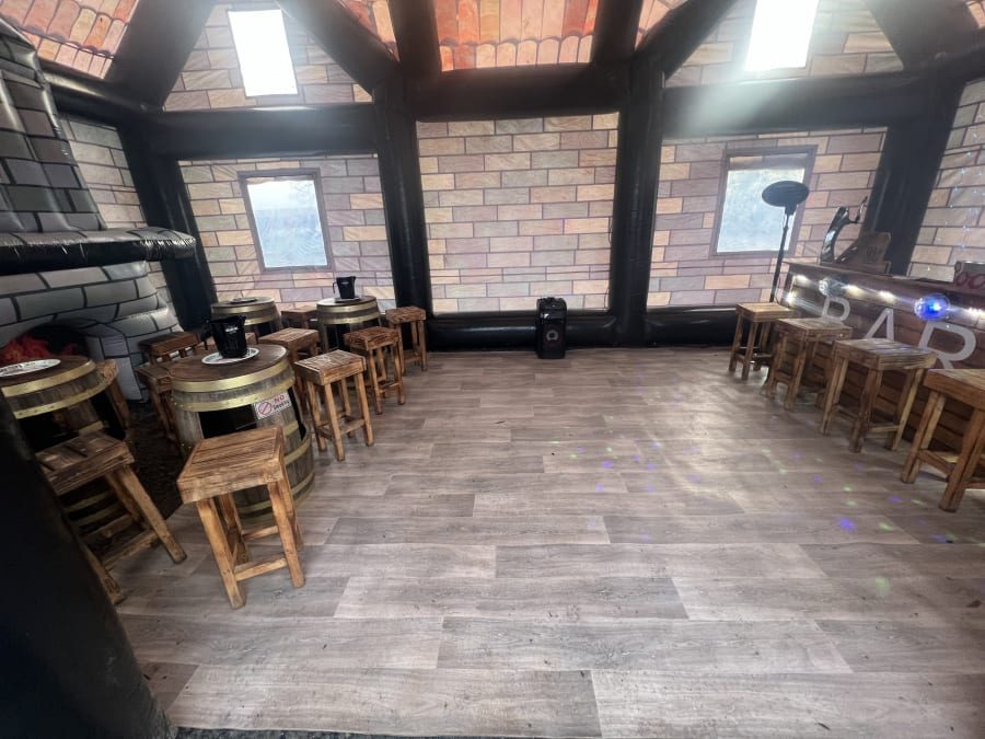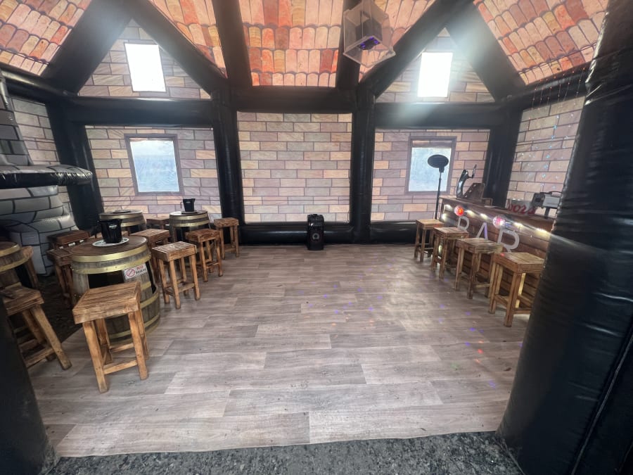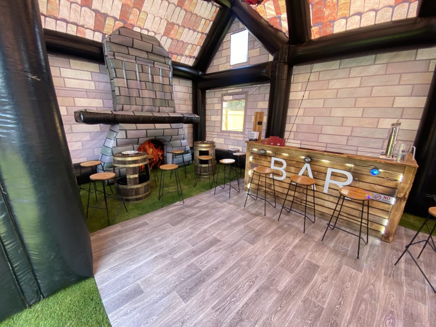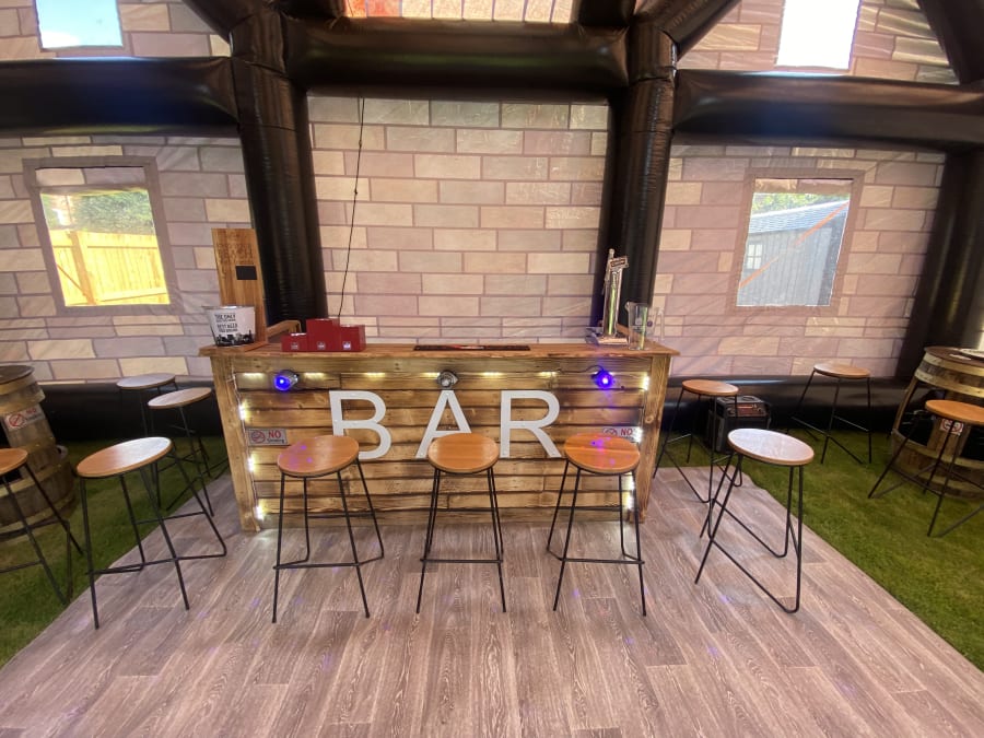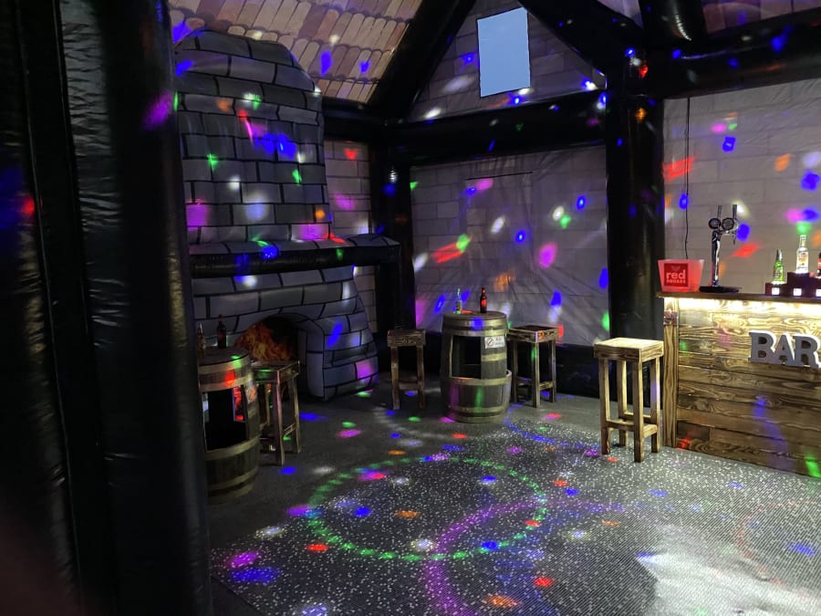 Giant pub whopping 35ft long and 20ft wide 20ft height impressive holds up to 80 people comes with 4no disco lights or Lazer lights illuminated bar with built in disco lights beer pump for show 4no ice beer barrel tables 16no bar stools soft affect disco floor for the middle block rocker speaker light up beer bottle stands and ice buckets and beer mats and coasters and space heater to keep the party warm we drop off mid morning and collect next day we can drop off times to suit your party or if it’s a surprise arrangement can be made please state when ordering please note THIS CAN ONLY GO ONTO GRASS NOT SUITABLE FOR HARD SURFACES. also must have at least 4ft in access us this is trailer mounted will not fit trow your average gate please contact us on 07740397745 for information