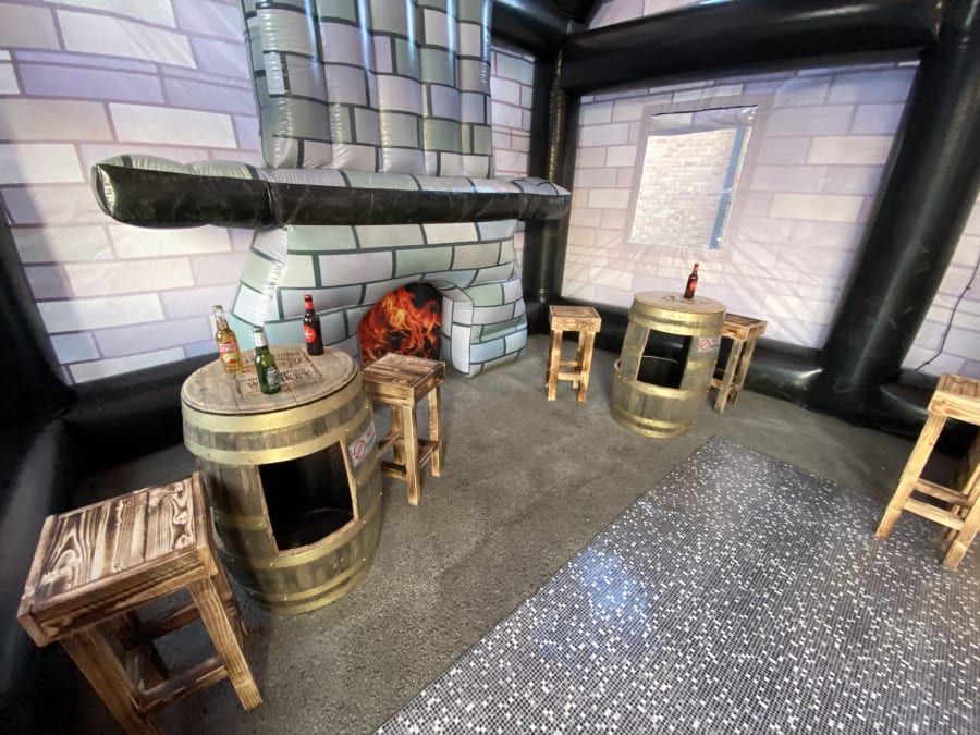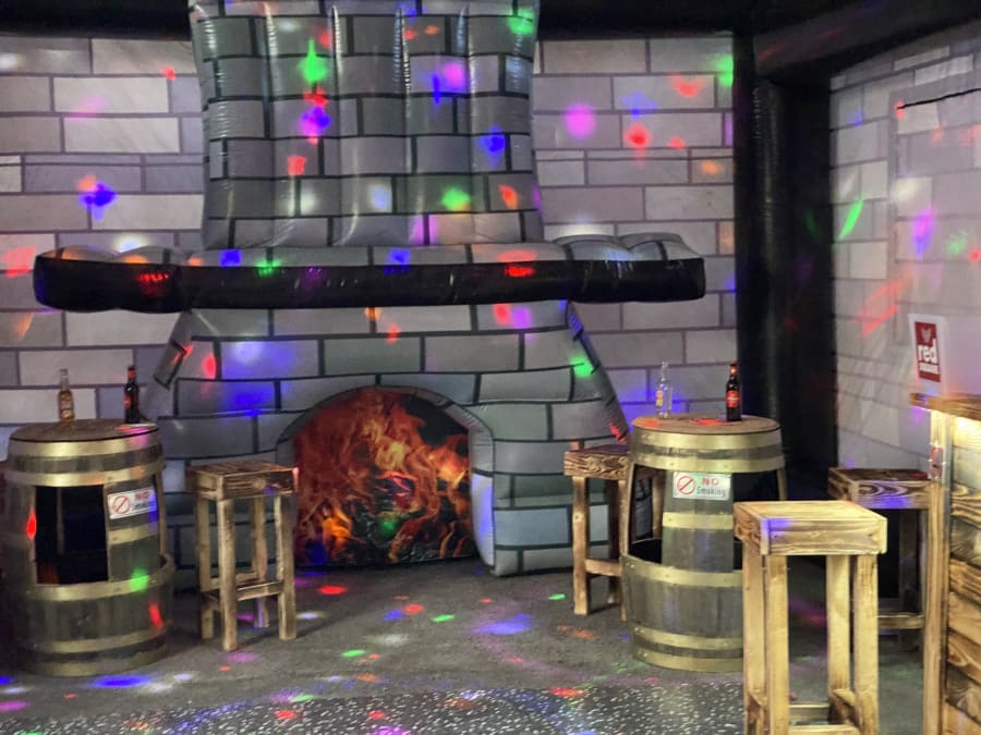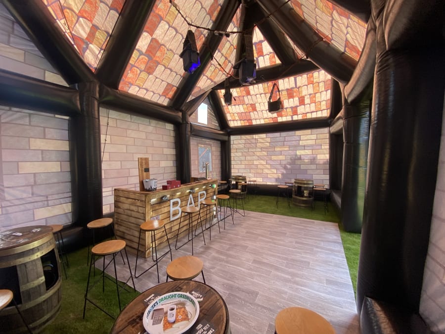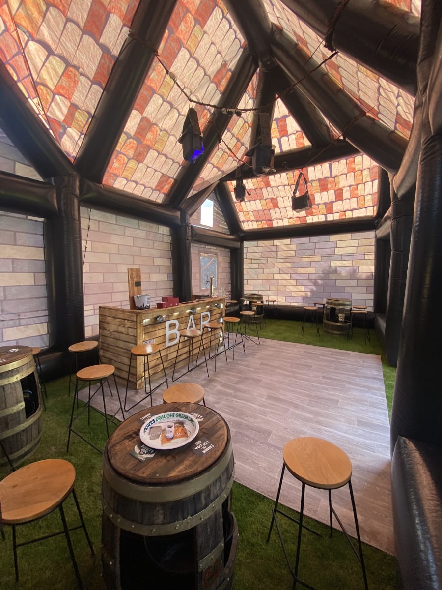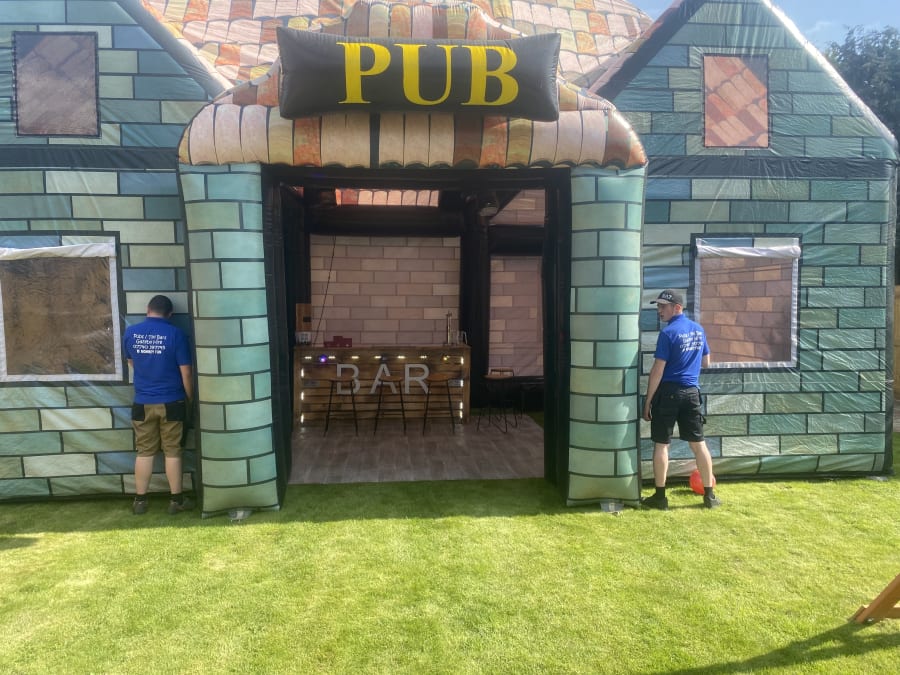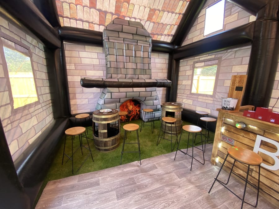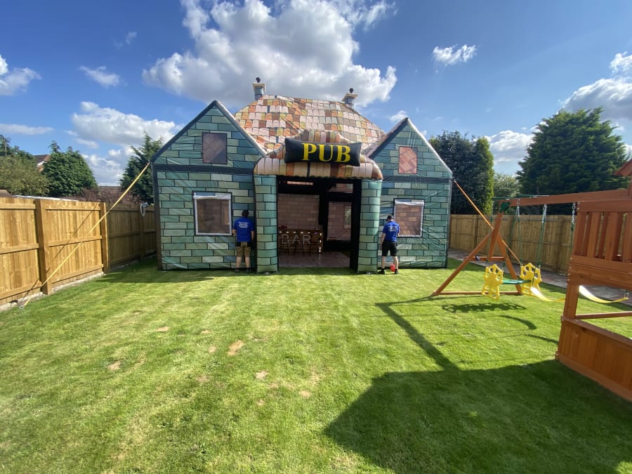 Giant pub whopping 35ft long and 20ft wide 20ft height impressive holds up to 80 people comes with 4no disco lights or Lazer lights illuminated bar with built in disco lights beer pump for show 4no ice beer barrel tables 16no bar stools soft affect disco floor for the middle block rocker speaker light up beer bottle stands and ice buckets and beer mats and coasters and space heater to keep the party warm we drop off mid morning and collect next day we can drop off times to suit your party or if it’s a surprise arrangement can be made please state when ordering please note THIS CAN ONLY GO ONTO GRASS NOT SUITABLE FOR HARD SURFACES. also must have at least 4ft in access us this is trailer mounted will not fit trow your average gate please contact us on 07740397745 for information
